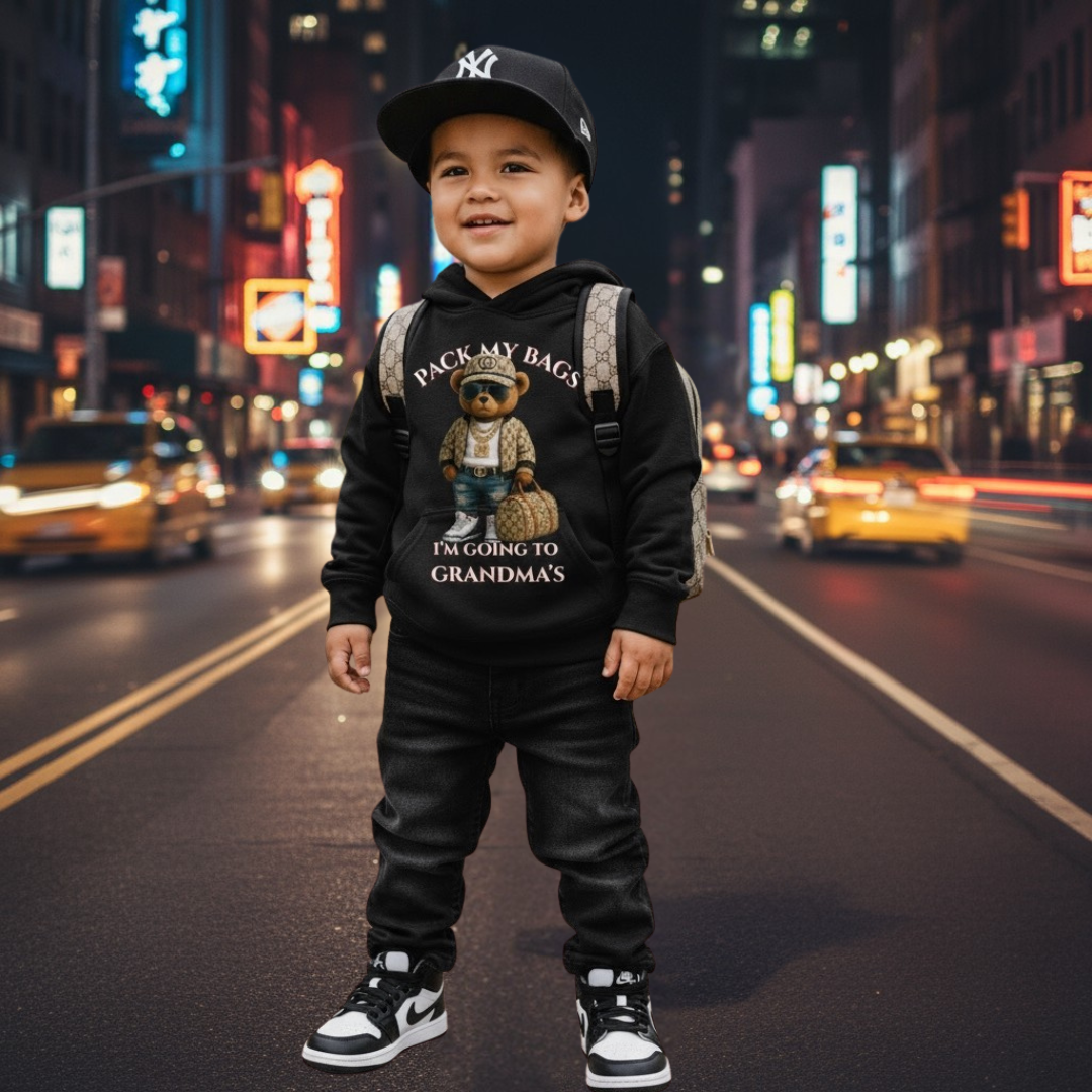 Get ready to roll out in style with the Pack My Bags Hoodie — the ultimate drip for boys who love to travel, chill, and show off their confidence. Featuring a luxury-inspired bear rocking designer gear, this hoodie says it all: “I’m going to Grandma’s!”